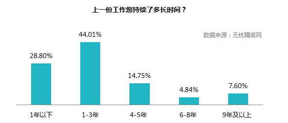 在此次调查中,年薪达到10万以上的受访者占比71.83%, 28%的受访者在一年内有过一次跳槽,44.01%的受访者则在三年左右的时间里经历过一次离职,在一家公司工作四年以上才离职的占比不到28%。