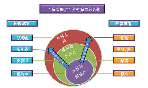 打造乡村旅游综合体,就是要深度挖掘乡村特色资源,倡导低碳、生态等科学理念,以乡村旅游资源与土地为基础,以乡村旅游休闲为脉络,以休闲商业为配套,以乡村休闲地产为核心,以高品质服务为保障,对项目地进行综合开发,把乡村打造成一个“岛式圈层”结构的乡村旅游综合体,满足政府、企业、居民、乡村旅游者等多方需求。