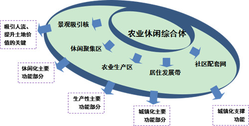 在新型城镇化构架下,农业休闲综合体实际上是由五个部分构成:景观吸引核、休闲聚集区、农业生产区、居住发展带、社区配套网。