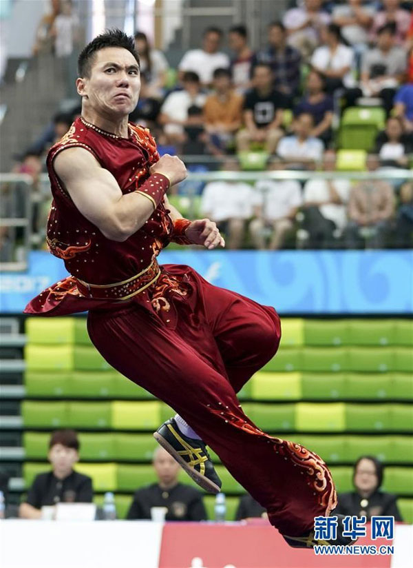 8月30日,在天津进行的第十三届全运会武术套路男子南拳南刀南棍全能决赛中,浙江队选手王地以9.710分的成绩暂列第一。 新华社记者赵戈摄