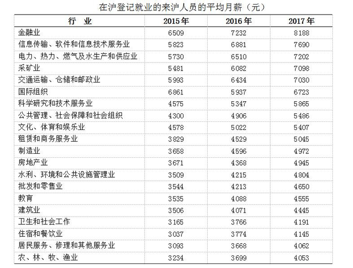 报告显示,2017年6月,在沪登记就业的外省市户籍来沪人员共455.1万人,平均月薪为5095元,其中金融业最高,为8188元,IT行业紧随其后。