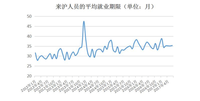 从来沪人员的平均就业周期来看,截至2017年6月,在沪登记就业的外省市户籍来沪人员的平均就业期限为35.3个月,与五年前同期水平相比上升了6.8个月,总体而言有逐年增长的态势。调查数据则显示,在当前单位就业6个月以上的来沪人员约占89.9%,来沪人员在沪就业的稳定程度不断提高。