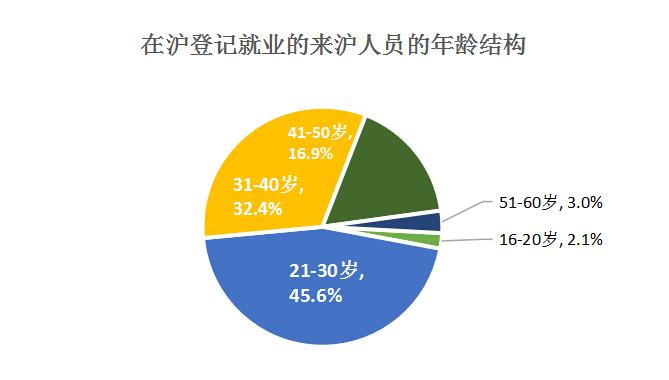 根据统计,2017年6月,在上海办理了就业登记的外省市户籍来沪人员的平均年龄为32.7岁,与5年前同期水平相比上升了1.9岁。从年龄结构来看,21—30岁的来沪人员所占比重最高,约占45.6%,40岁以下的青壮年劳动力合计超八成,仍然是来沪人员的主力军。