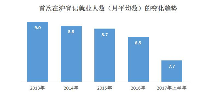另一方面,今年上半年,首次在沪登记就业的月均人数为7.7万人,较2016年同期减少0.1万人,近年来连年呈现下降趋势。
