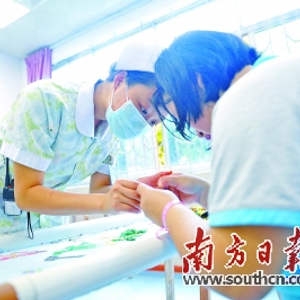伍仲珮纪念医院康复科的护士指导患者进行手工刺绣。