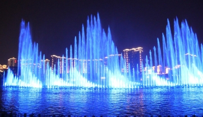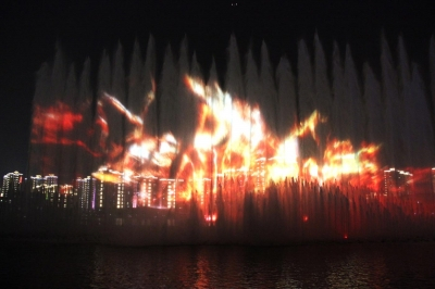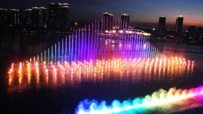随着音乐响起,湖面上流光溢彩,超大水柱起起伏伏,水雾弥漫……