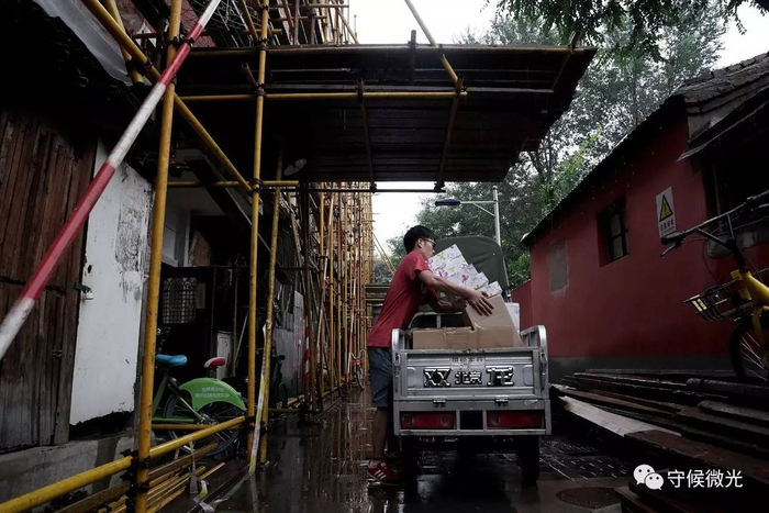 8月27日,北京西二环外展览路附近的一处居民楼下,鲁修勇将从仓库搬出的货物装车。6年前,鲁修勇的姐姐和姐夫在附近的天意新商城开了家陶瓷工艺品店,之后他也从湖北仙桃老家过来帮忙。