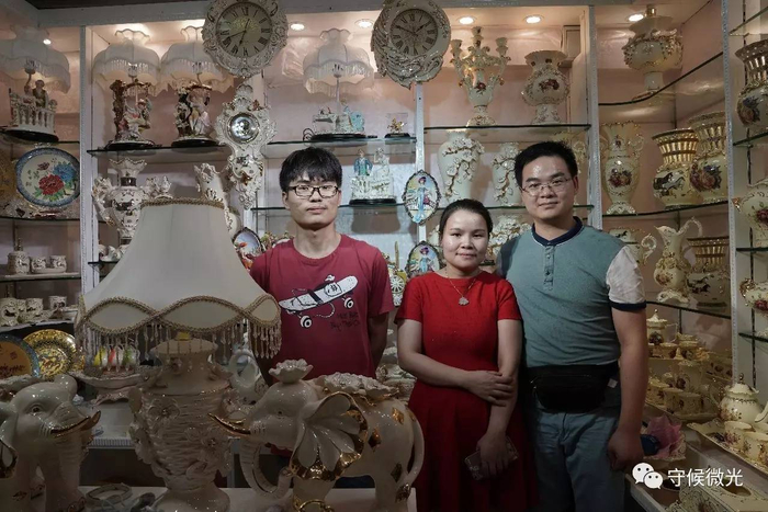 8月25日,天意新商城,(右起)陈平、鲁莎莎和鲁修勇在自家的陶瓷工艺品店前。陈平来自湖北仙桃,今年30岁。6年前,他大学毕业后和爱人鲁莎莎一起创业,在天意开了这家店。靠着这几年的打拼,他们夫妻俩在河北香河买了属于自己的房子。陈平听市场的人说,这段时间,天意方面正在北京周边选址,准备开辟新的小商品市场。“有一种说法是在燕郊,但还没有确定。”他说。