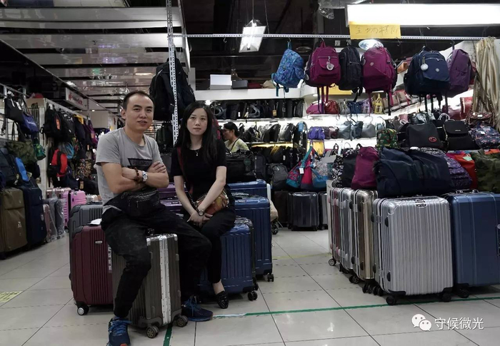 8月26日,万通商城,35岁的王彩霞(右)和老公在自家的箱包店前。王彩霞来自安徽合肥,谈起10多年来的生意,她很有感慨:“奥运会前后是个顶峰,生意很好”,最近几年生意受网店冲击很大。对于市场关闭后的打算,她说还没想好,当务之急是把自家的存货卖完。