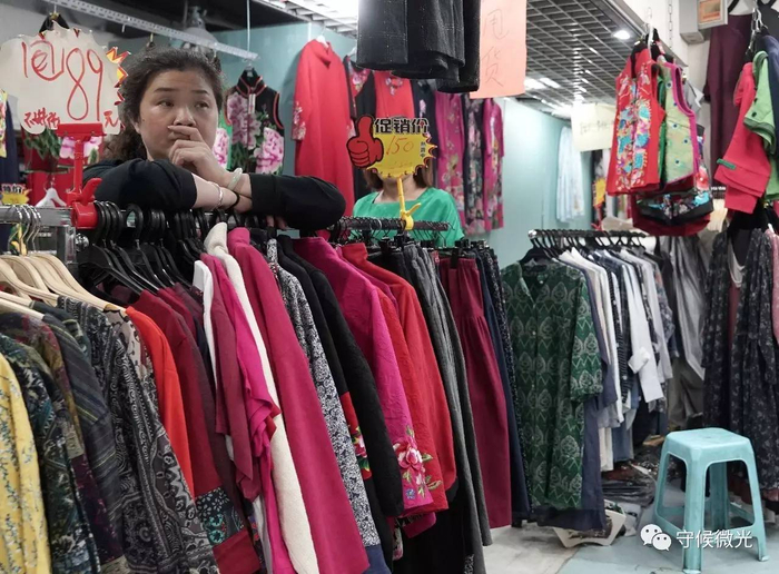 8月24日,万通商城,来自安徽无为的张大姐在自家的服装摊位上。