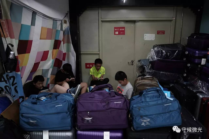 8月24日,万通商城,几位“摊二代”在一排箱子后用手机玩游戏。