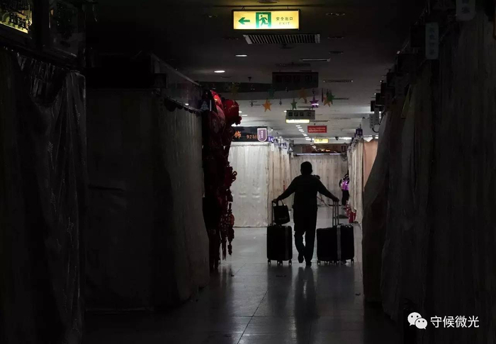 8月27日,天意新商城,市场关门时间已到,一位扫货的顾客拖着箱子寻找出口。