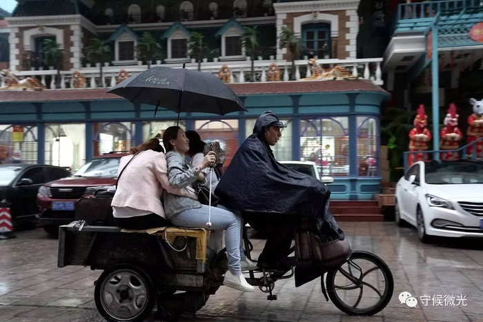 8月27日,天意新商城前,原本拉货的三轮车,成了雨中临时载客的摆渡车。