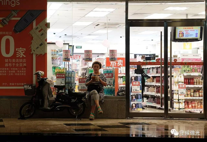 8月27日,万通商城楼下,一位顾客坐在一家万宁连锁超市外。几年前,万通商城在转型过程中引入了万宁化妆品超市、美食广场等配套设施。