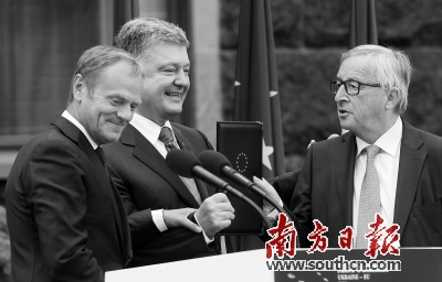 7月13日,乌克兰总统波罗申科(中)、欧洲理事会主席图斯克(左)和欧盟委员会主席容克出席乌克兰—欧盟峰会后的联合记者会。新华社发