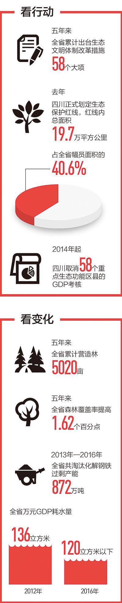 在加的方面:2013年以来,省委常委会常态化学习习近平总书记关于生态文明建设的战略思想,省委全会出台《关于推进绿色发展建设美丽四川的决定》,省政府常务会议32次审议有关生态环境保护的议题。不断加强制度建设,划定生态保护红线19.7万平方公里、占全省总面积的40.6%,全面落实河长制、建立省市县乡四级河长体系。持续加大投入,2013年以来省级财政共投入生态环保专项资金800多亿元,2016年集中开工400多个污染防治重大项目、总投资540多亿元。加力生态建设,启动绿化全川行动,全面推进“有山皆绿”“身边增绿”,2013年以来累计营造林4500万亩,2016年森林覆盖率比2012年增加1.6个百分点。