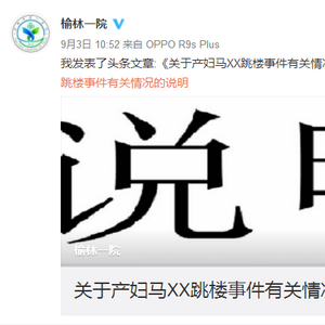 未来网(www.k618.cn)北京9月5日电(记者 宋霞霞)今天(9月5日)上午,陕西榆林市第一医院官方微博@榆林一院发布《关于产妇马XX跳楼事件有关情况的说明》,说明中称,该产妇跳楼身亡的根本原因与医院诊疗行为无关。