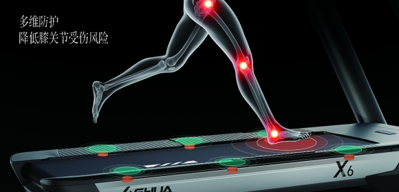 全跑台减震系统使X6跑台更接近塑胶跑道的硬度系数,满足各种跑步习惯,弹韧适中,大量吸收落脚时体重2.5倍冲击力。