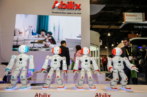 1月7日,上海未来伙伴机器人公司研发的能力风暴系列教育机器人亮相美国拉斯维加斯消费电子展。(新华社)