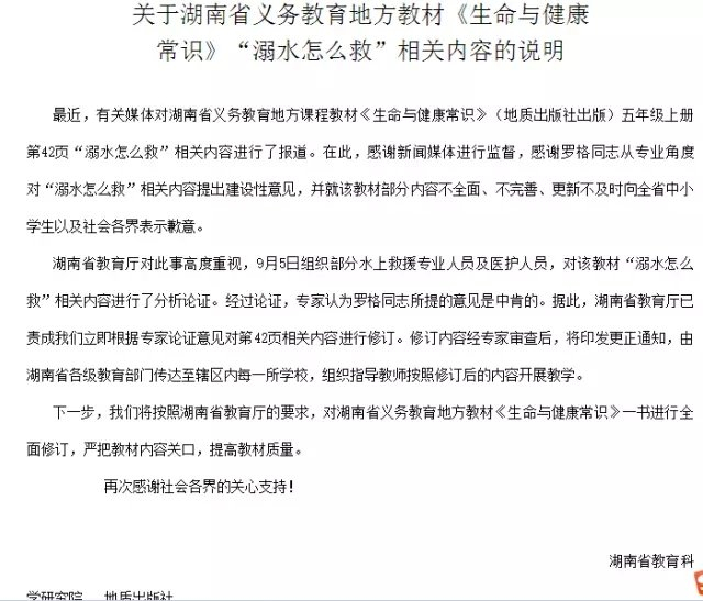 日前,一则题为《小学课本惊现致命错误!如此“救人”反会害死人》的报道引发广泛关注,文章直指湖南省义务教育地方课程实验教科书《生命与健康常识》关于“溺水怎么救护”的内容,存在两处“致命错误”。