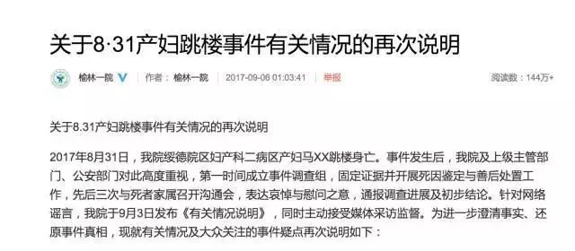 9月5日深夜,榆林市第一医院官方发布《关于8.31产妇跳楼事件有关情况的再次说明》称, 产妇马某系成年人,且无精神病史,具备完全行为能力,即使在待产室内医院也无权限制其人身自由;一般产妇顺产的产程长达数小时,中途多数会起身在分娩中心外与家属谈话或散步助产;该产妇曾多次走出分娩中心与家属沟通,因此其最后一次走出待产室时,助产士未料到该产妇会进入待产室对面的备用手术室跳楼身亡。