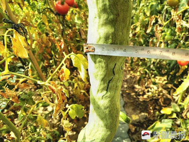 新疆晨报记者站在菜园外就能看见4根一米多长的蛇豆挂在枝头,远看就像是巨型豇豆,但走近看又像是丝瓜,足足有手腕般粗细,有的弯曲盘旋在空中,乍眼看还有些酷似青蛇。观察后发现,蛇豆的表面呈浅绿色,长柱型,尾部渐尖细,有的已经弯曲盘旋,有的伸直生长垂在地上。通过现场测量,牛学颜种植的蛇豆最长的达到1.56米,最粗的直径到达4厘米。