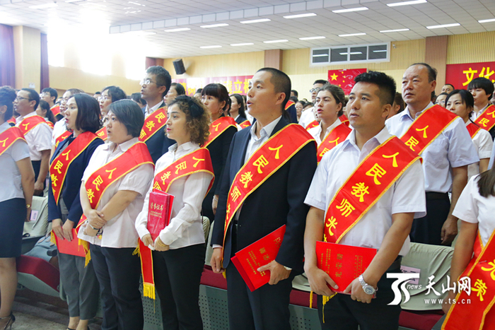 乌鲁木齐市第33个教师节庆祝大会现场被表彰的老师们正在唱国歌。