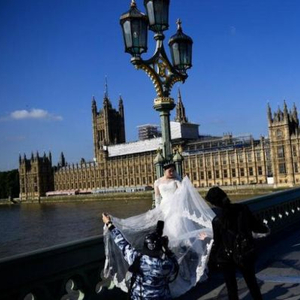 新人在伦敦威斯敏斯特大桥前拍摄婚纱照(路透社)
