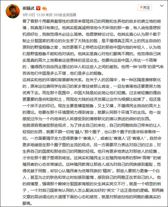 对此,北京大学中文系教授张颐武也于昨天(10日)在微博发表长文,“看了看那个用最具羞辱性的语言来辱骂自己的同胞和生养他的故乡的唐立培的微博,我真是只有难过”,“(唐同学)要不顾一切地‘融入’那个圈子,也以那个圈子的是非标准看待一切。一方面要竭尽全力显得更像个‘香港人’,或者比‘香港人’还‘香港人’,自然会更多地接受在那个圈子里的主流的观点。另一方面要尽力表达对自己的过去,对生养自己的国度和那些自己的同胞的轻视。他只有更多地表达对那些人的轻蔑,才会在那个圈子里得到肯定。这其实和殖民主义在殖民地培养的那种“高等”的被殖民者的心态非常接近。”
