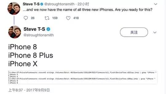 9月9日,应用程序和游戏开发者史蒂夫·特劳顿史密斯在其社交平台中公布,苹果即将发布的三款手机将被命名为iPhone8,iPhone8Plus和iPhoneX。