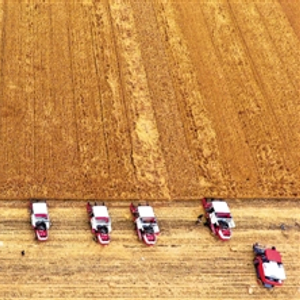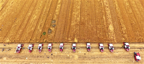 上图 10余台收割机在山东省济宁市嘉祥县收割小麦。 新华社记者 郭绪雷摄