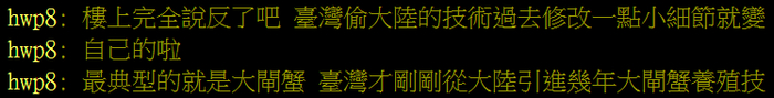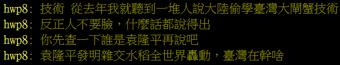 消息一出,引起了众多台湾网友的热议。有网友称,大陆的大闸蟹技术、稻米技术都是偷学的台湾,甚至有人直接说“用火也是台湾教的”。其他网友反驳称“说反了吧,台湾偷大陆的技术过去修改一点小细节就变自己的了”,“反正人不要脸,什么话都说得出”,“袁隆平杂交水稻轰动全世界,台湾在干啥”。