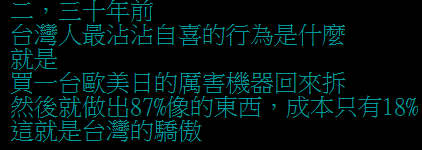 还有网友称,“二三十年前,台湾人最沾沾自喜的,就是买一台欧美日的机器回来拆,然后做出很像的东西,成本只有18%,这就是台湾的骄傲”,而现在呢?