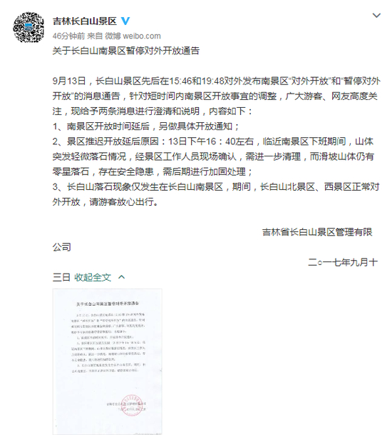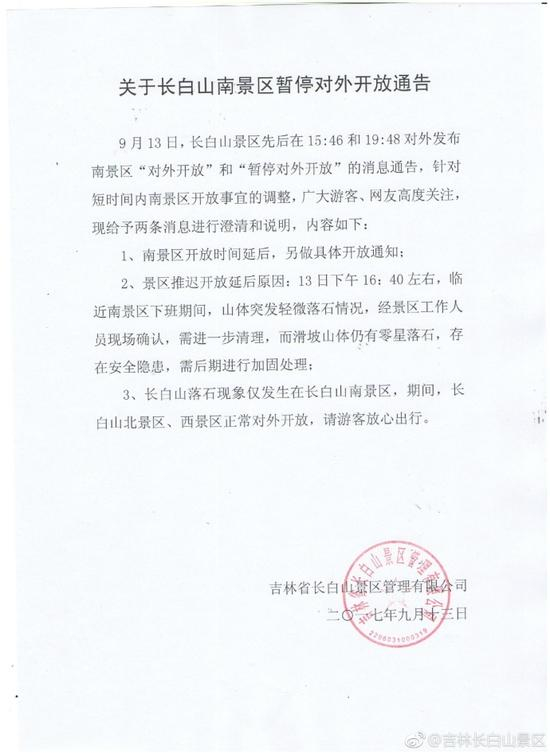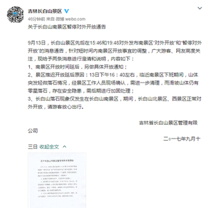 9月13日,长白山景区先后在15:46和19:48对外发布南景区“对外开放”和“暂停对外开放”的消息通告,针对短时间内南景区开放事宜的调整,广大游客、网友高度关注,现给予两条消息进行澄清和说明,内容如下: