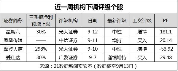 4只被下调评级的个股,分别是星期六、凤凰传媒、摩登大道、爱仕达。尽管三季报预喜,但星期六、摩登大道双双被光大证券分析师李婕下调至中性评级,在她看来,估值偏高。