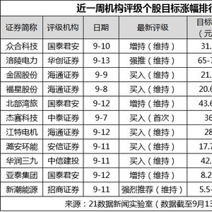10股目标涨幅超50%据21数据新闻实验室统计,最近一周(9月7日至9月13日),券商一共针对362家公司发布了个股评级研究报告。