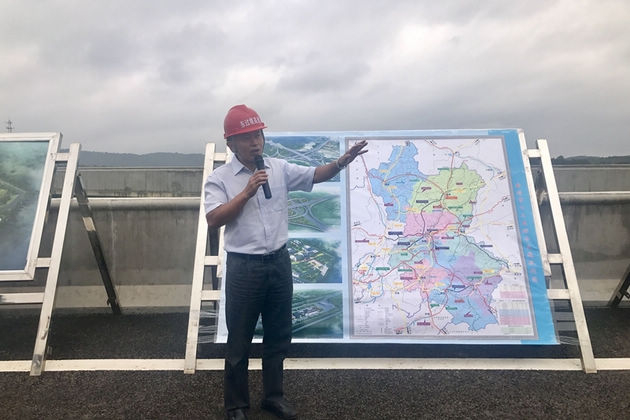 曲靖市交通运输局局长段宏波向记者介绍曲靖东过境高速公路情况。