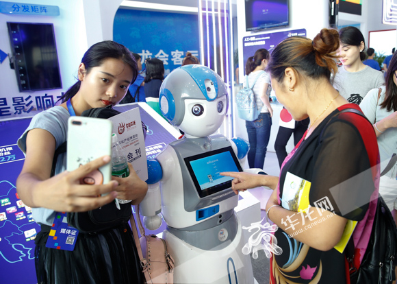 智能机器人“龙小宝”在华龙网集团展位等你,快来合影互动。记者 石涛 摄