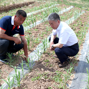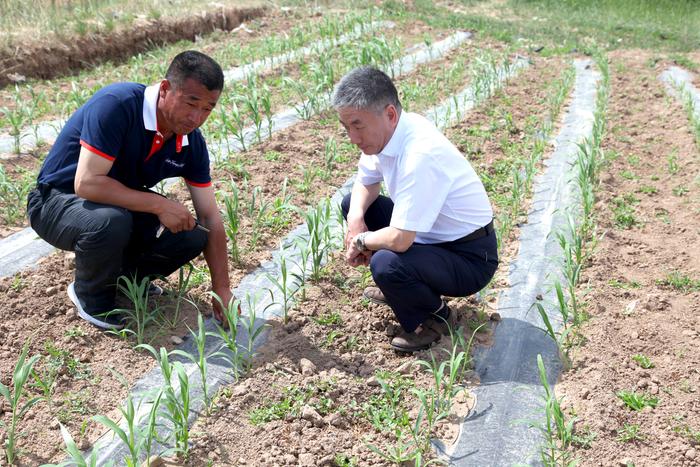 中铁十四局扶贫干部孙洁(右)采取订单式农业模式,在甲石河乡侯达子沟村建立了订单式农产品供应基地,种植玉米、谷子等无公害杂粮265亩