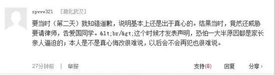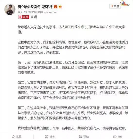 我也是90后,比唐同学年纪稍微大点。看到唐同学发的致歉声明后,我觉得唐同学的歉意和愧疚是真实的,应该给他通过自省而自我成长的空间。