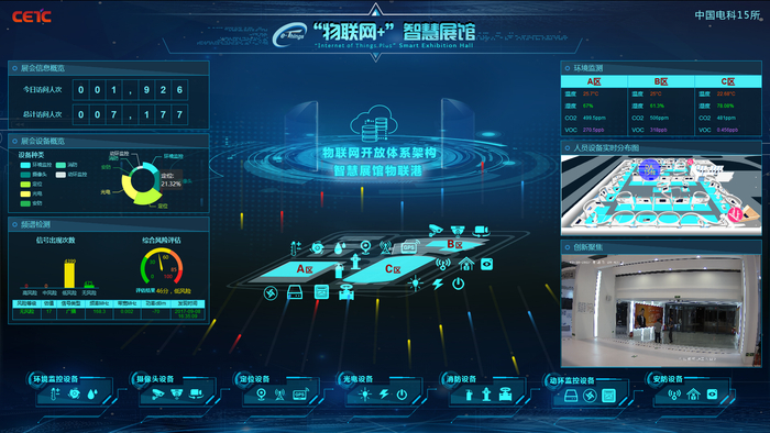 在智能展区方面,基于自主知识产权的物联网通用开放平台和龙云服务,利用网信技术,构建智慧展馆,实现重要展品定位、空气环境感知、展位消防预警、用电安全监测、电磁频谱管控、公共扩声服务、视频安防监控、太赫兹人体安检、出入人流统计、及人脸智能识别。