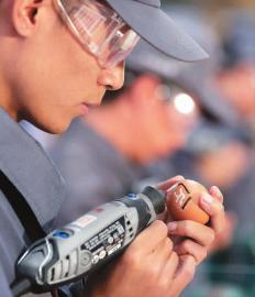 比赛开始后,10名高铁工匠右手拿旋转锉,左手握住鸡蛋,可是鸡蛋壳又薄又脆,厚度只有0.3毫米,而包裹蛋清和蛋白的膜只有0.02毫米,是头发丝的三分之一。想在鸡蛋上刻字,着实不易,手上的锉轻触蛋后旋即离开,手上的力度需要又稳又准,“为了让手稳,不能喝酒,除了刻字之外,刻出的笔法要合格才算通过。”刘君说。