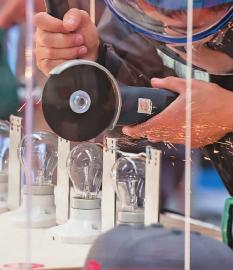 火花飞溅中,工人张富军用电动角磨机小心地操作着,这让现场所有人都屏住呼吸,在普通人眼中,如此近的距离用电动角磨机磨断铁丝而不损坏灯炮简直是不可能的,可随着铁丝一一被切断,灯泡全部亮起。