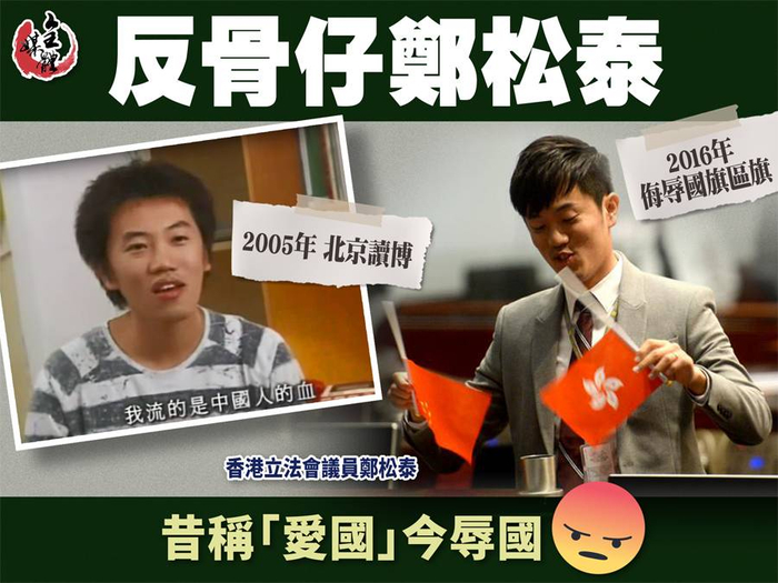 据港媒爆料,极为讽刺的是,郑松泰2005年在北京大学修读博士学位时接受媒体采访,曾表白“我是中国人,我流的是中国人的血。”几年过去,:“爱国男”变成为辱国辱港分子,郑松泰变脸伎俩着实让人目瞪口呆。