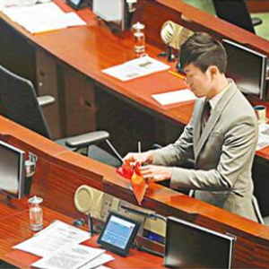 郑松泰把议员座席上的国旗和香港特区区旗倒转(图源:香港文汇网)