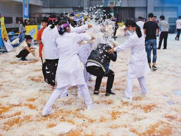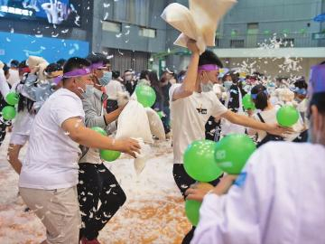 A05版16日,长春中医药大学体育馆内举行了一场枕头大战。下午4点30分,同学们陆续进场,有的戴上了面具,有的系上了发带,并用记号笔在领取的枕头上或画或写,记上了想要发泄的话语。随后,400余名同学排成长队大跳“兔子舞”热身,然后进入枕头大战。枕头大战中,羽毛满地飞,同学们挥舞手中的枕头,发泄着。4位刚刚结束实验课没来及换下白大褂的女生用手中的枕头拍在一个男生头上,一位女生笑着喊:“今天太开心了。”