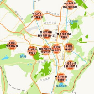 地理位置:城区北部。规划定位:利用支水系铁厂沟河、柏杨河、黑沟河水系,以山水林田为生态基底,形成一条自然与新区建设加核心利用的景观廊道。