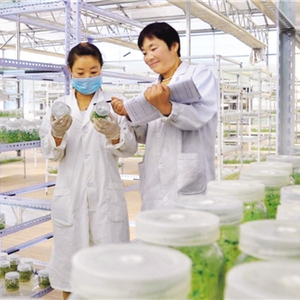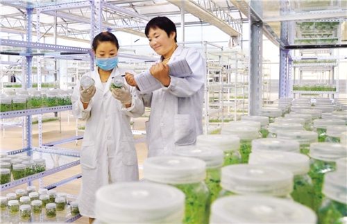 民旺马铃薯合作社的员工在温室内记录马铃薯脱毒种薯的生长情况。