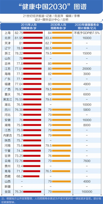 “健康中国2030”图谱: 上海人均预期寿命最高,江苏健康服务业第一