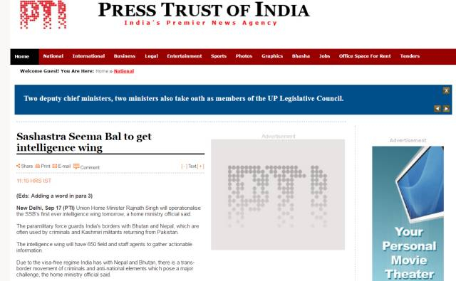印度报业托拉斯(PTI)对印度决定增兵一事的报道。